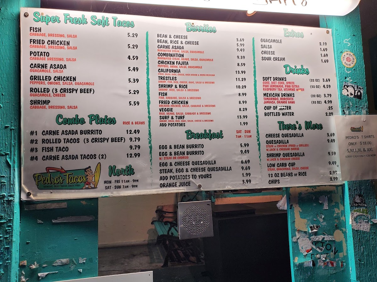 Proudly serving the vibrant community of San Clemente, Pedro's Tacos is your go-to fast food haven for authentic Mexican cuisine. Located at 550 N El Camino Real, this bustling eatery delights taco enthusiasts with a tempting menu that highlights a variety of options. The Famous Fish Taco and Carne Asada Taco showcase a perfect blend of flavors, featuring fresh ingredients like cabbage, guacamole, and house-made salsa. Don't miss the chance to indulge in their inventive burritos, including the mouthwatering Carne Asada Burrito and the zesty Shrimp Burrito.